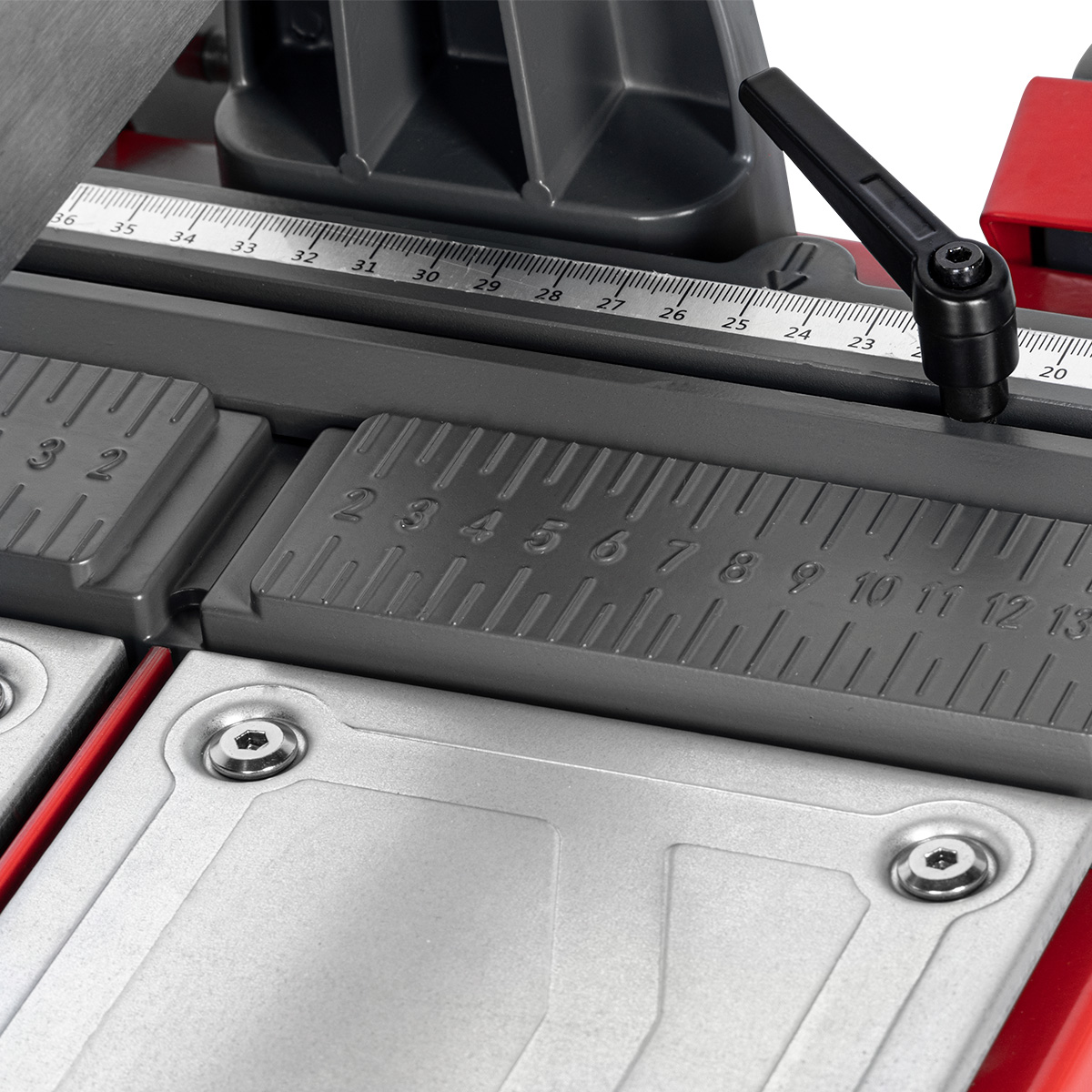 Built-in roller bearings provide outstanding accuracy with every cut. The aluminum ruler with a protractor allows precise positioning, while the ergonomically designed handle with a ball bearing ensures smooth and accurate blade guidance. The machine is stable and durable, weighing 15.5 kg, and the extended support base further enhances stability during operation.