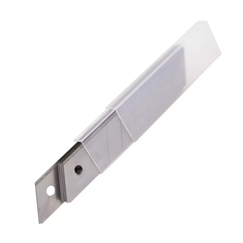 Blades 25mm 10/1 in a pack of 10 pieces, with dimensions of 25 mm in width, 130 mm in length, and 0.5 mm in thickness, featuring 7 perforated breakable segments. Made of high-carbon SK5 steel, they offer superior wear resistance and a perfect balance between toughness and sharpness. This material makes the blades exceptionally durable and suitable for intensive use.